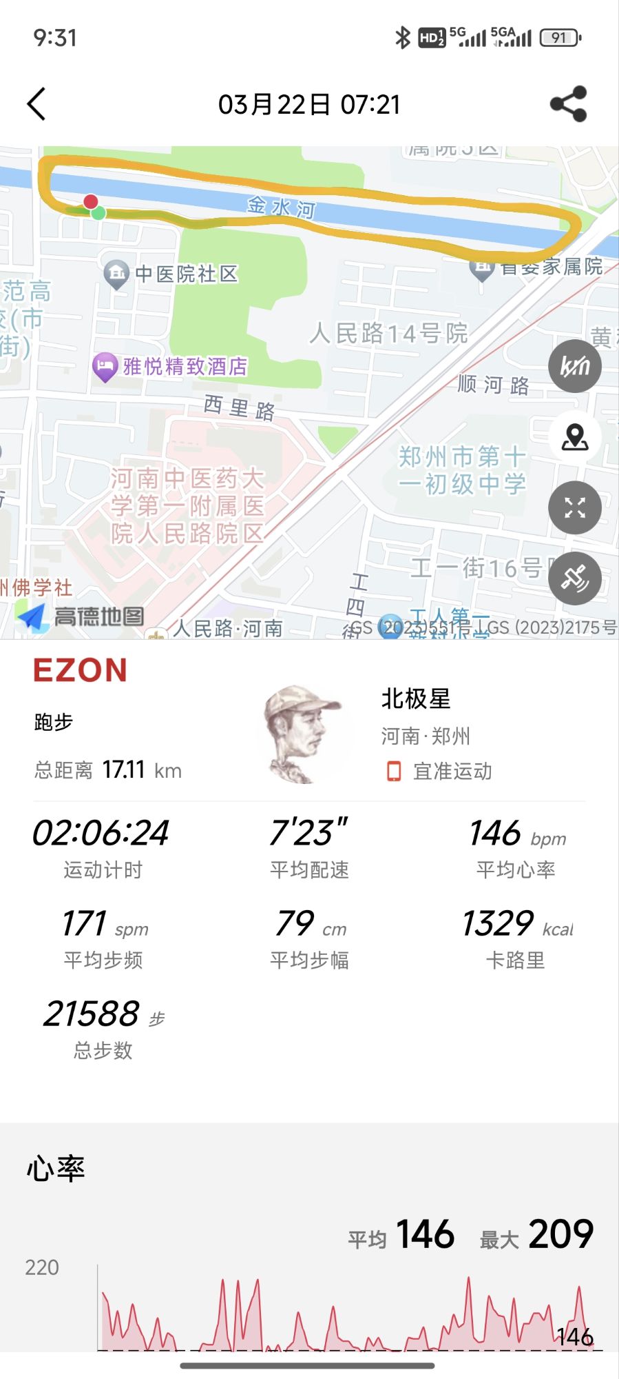 这是小米手机第一次连心率带跑步,飘了,看来任何科技产品都要留一份怀疑啊。佳明今天表现得反而是出奇的稳定,因为今天天气不错,空气也可以,总之从体感上看,心率在平常水平。